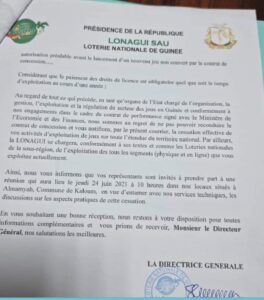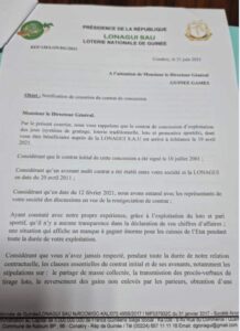 Selon le courrier de la LONAGUI, ce contrat signé en 2001 avait expiré depuis des mois. En plus, la LONAGUI dit aussi se rendre compte que Guinée Games faisait de fausses déclarations qui ont entraîné d’énormes pertes pour l’Etat sur ce qu’il devait percevoir.