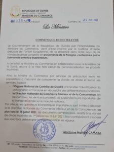 Dans un communiqué dont guineelive détient copie, le ministère du Commerce dit avoir été saisi par le système d’alerte de l’Union européenne de la présence en Guinée de la viande de dinde congelée en provenance de la Pologne, contaminée par la “Salmonelle enterica thyphimirium”