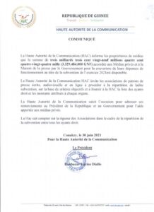 Dans un communiqué rendu public, la Haute Autorité de la Communication (HAC) informe la presse privée du paiement par le gouvernement de la subvention pour l’exercice 2021.