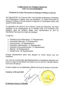 Le même du PM précise que les noms des membres et leurs suppléants désignés sont reçus au siège du cadre permanent du dialogue politique et social, sis à la villa 36 à la cité des nations.