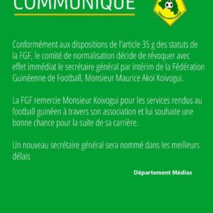 C’est à travers un communiqué publié sur sa page que l’instance de transition du football guinéen a notifié cette information. Un nouveau secrétaire général sera nommé dans les prochains jours.