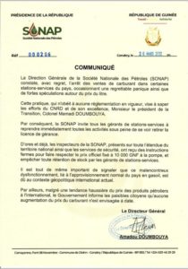 Dans un communiqué dont guineelive détient copie, le directeur général de la Société nationale des pétroles (SONAP) Amadou Doumbouya a indiqué qu’aucune augmentation du prix du carburant n’est envisagée à date.