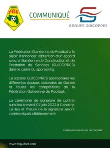 Dans un communiqué publié dans la soirée du vendredi 28 mai, la fédération Guinéenne de Football a annonce avoir trouvé accord de sponsoring avec la société Guicopres de Kerfalla Camara,KPC.