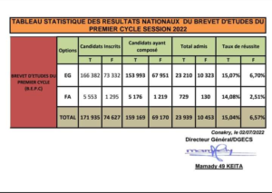 Ce lundi 04 juillet 2022, le ministère de l’enseignement pré-universitaire et de l’alphabétisation a publié cet après-midi, le tableau statistique des résultats du brevet d’études du premier cycle (BEPC) session 2022.