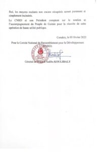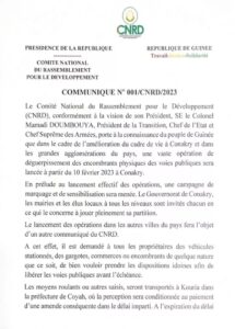 Dans un communiqué signé du chef d’état major général des armées, le général de brigade Sadiba Koulibaly, le CNRD annonce une vaste opération de déguerpissement des encombrants physiques des voies publiques à partir du 10 février à Conakry.