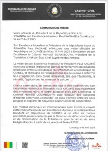 Le Président Rwandais Paul Kagamé effectuera une visite de travail en Guinée du 16 au 17 avril 2023. L’information est donnée par la direction de la communication et de l’information de la présidence de la République.