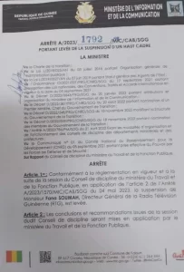 Dans un arrêté dont Guineelive détient copie, la ministre de l’Information et de la communication a levé ce lundi 22 mai 2023, la sanction de Fana Soumah, directeur général de la RTG.