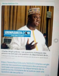 Dans un article publié chez nos confrères du site lerenifleur224.com, titré « Charles Wright précise : les questions d’attaques des prisons ne sont pas une question du département de la justice ou du ministère de la sécurité, c’est une question de sécurité nationale », cela prouve une fois encore que Alphonse Charles Wright ne fait que des communications que les guinéens n’ont pas besoin en ce moment. Alors que dans tous ses discours, il parle des reformes engagées avec ses tournées souvent sur fond de fanfare à l’intérieur du pays. Mais hélas…