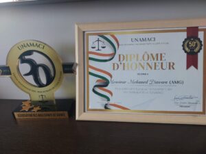 Eu égard aux liens qui unissent l’UNAMACI et l’Association des Magistrats de Guinée, en termes de promotion, de protection et de sauvegarde du pouvoir judiciaire dans les pays membres du Groupe Africain de l’Union Internationale des Magistrats, le Comité exécutif de l’UNAMACI n’a pas manqué de décerner à l’AMG un diplôme d’honneur et un trophée des 50ans remis à son Président, Mohamed DIAWARA.