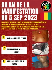 Les Forces Vives de Guinée condamnent l’assassinat lâche et tragique de Mamadou Pathé Baldé, âgé de 18 ans, Souleymane Diallo, âgé de 16 ans ainsi que Mouctar Keita âgé de 17 ans, présentent leurs condoléances les plus sincères aux familles endeuillées et souhaitent un prompt rétablissement aux blessés.