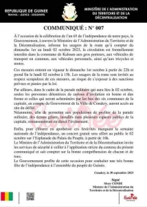 Le ministre de l’Administration du Territoire et de la Décentralisation invite les services de sécurité à veiller à l’application stricte du contenu du présent communiqué et sait compter sur la bonne compréhension de chacun et de tous. Le Gouvernement profite de cette occasion pour souhaiter une très bonne fête de l’indépendance à l’ensemble du peuple de Guinée.