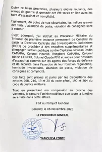 Avant d’ajouter que des poursuites pour des faits d’assassinats commis sur des agents des forces de défense et de sécurité sont engagées contre l’ex-président de la transition Dadis Camara, Moussa Tiégboro Camara, Claude Pivi, Blaise Gomou et autres.