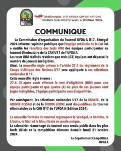 Par conséquent, les sélections nationales U17 de la GUINEE, de la GUINEE BISSAU et de la SIERRA LEONE sont disqualifiées du tournoi éliminatoire de la CAN U17 de l’UFOA A (Edition 2024).