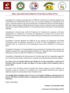 Dans une déclaration publiée ce mercredi 25 décembre 2024, les Forces Vives de Guinée ont réitéré leur décision de ne plus reconnaître, à partir du 31 décembre 2024, la transition militaire en cours en Guinée. Ses membres exigent le départ des militaires au pouvoir depuis le 05 septembre 2021 et la mise en place d’une transition civile en Janvier 2025.