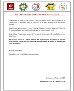 Le bras de fer entre les Forces Vives de Guinée (FVG) et les autorités de la transition s’intensifie. Dans une déclaration dont Guineelive.com a obtenu copie, les FVG ont appelé leurs représentants à se retirer de toutes les institutions de la transition.