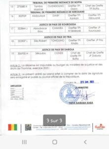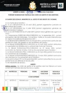 Conakry, 5 février 2025 – Par un arrêté en date du 29 janvier dernier, le Garde des Sceaux, Ministre de la Justice et des Droits de l’Homme, Yaya Kaïraba Kaba, a procédé à la nomination de plusieurs Chefs de Greffe et Greffiers dans diverses Cours et Tribunaux à travers le pays.