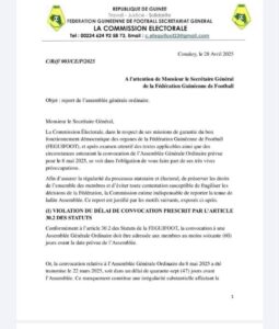 Cependant, dans un communiqué officiel publié ce lundi 28 avril, la Commission électorale de la Feguifoot a exigé le report de cette réunion. Elle justifie sa demande par l’existence de plusieurs irrégularités dans le processus de préparation de l’Assemblée, lesquelles, selon elle, pourraient compromettre son bon déroulement.