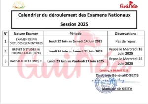 Le ministère de l’Enseignement pré-universitaire et de l’Alphabétisation (MEPU-A) a publié ce vendredi 2 mai 2025 le calendrier officiel des examens nationaux pour l’année scolaire en cours.