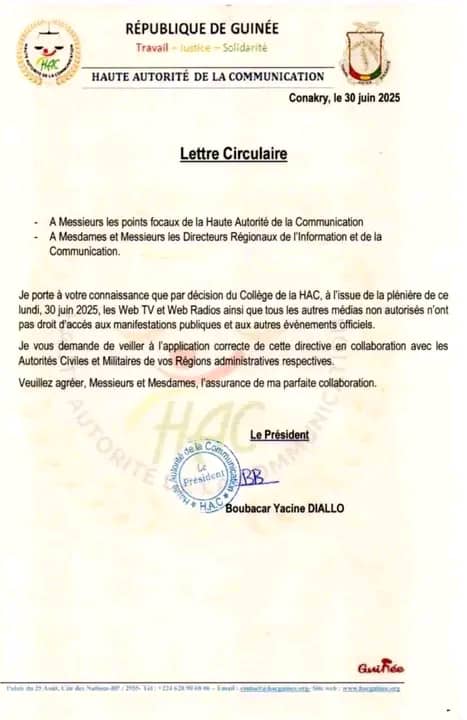 La Haute Autorité de la Communication (HAC) a annoncé ce lundi une nouvelle directive limitant l’accès des médias aux manifestations publiques et événements officiels en Guinée. Selon une note signée par son président, seuls les médias « autorisés » sont désormais habilités à couvrir ces activités officielles.
