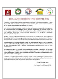 La publication du projet de nouvelle Constitution continue de susciter des réactions au sein de la classe politique et de la société civile. Ce lundi, les Forces Vives de la Nation ont exprimé leurs vives inquiétudes face à la non-reconduction de l’article 46 de la Charte de la transition.