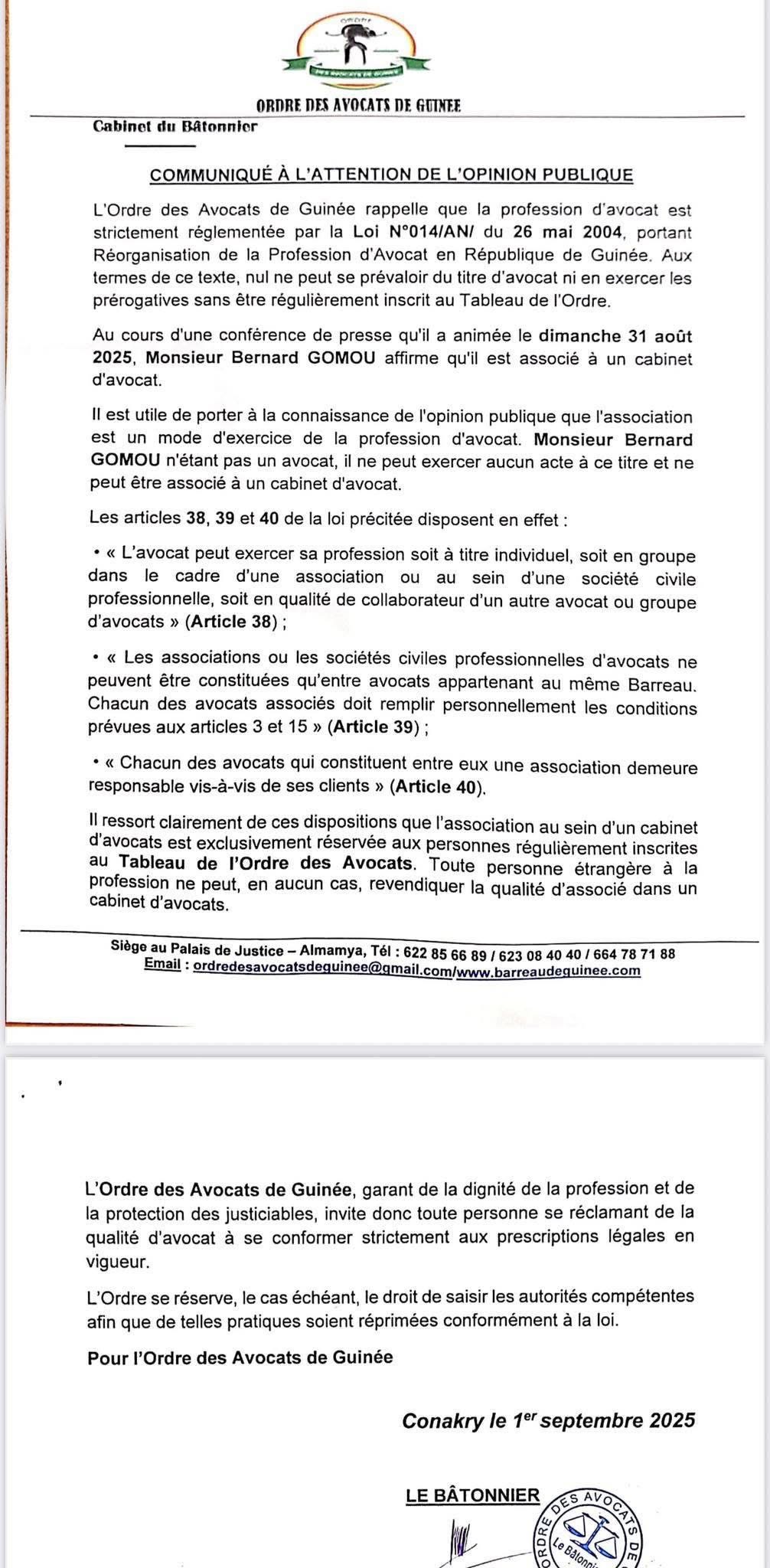 L’Ordre des avocats de Guinée a vivement réagi ce lundi 1er septembre 2025 à une déclaration de l’ancien Premier ministre, Dr Bernard Goumou, qui avait affirmé, la veille lors d’une conférence de presse à Conakry, être désormais associé à un cabinet d’avocats.
