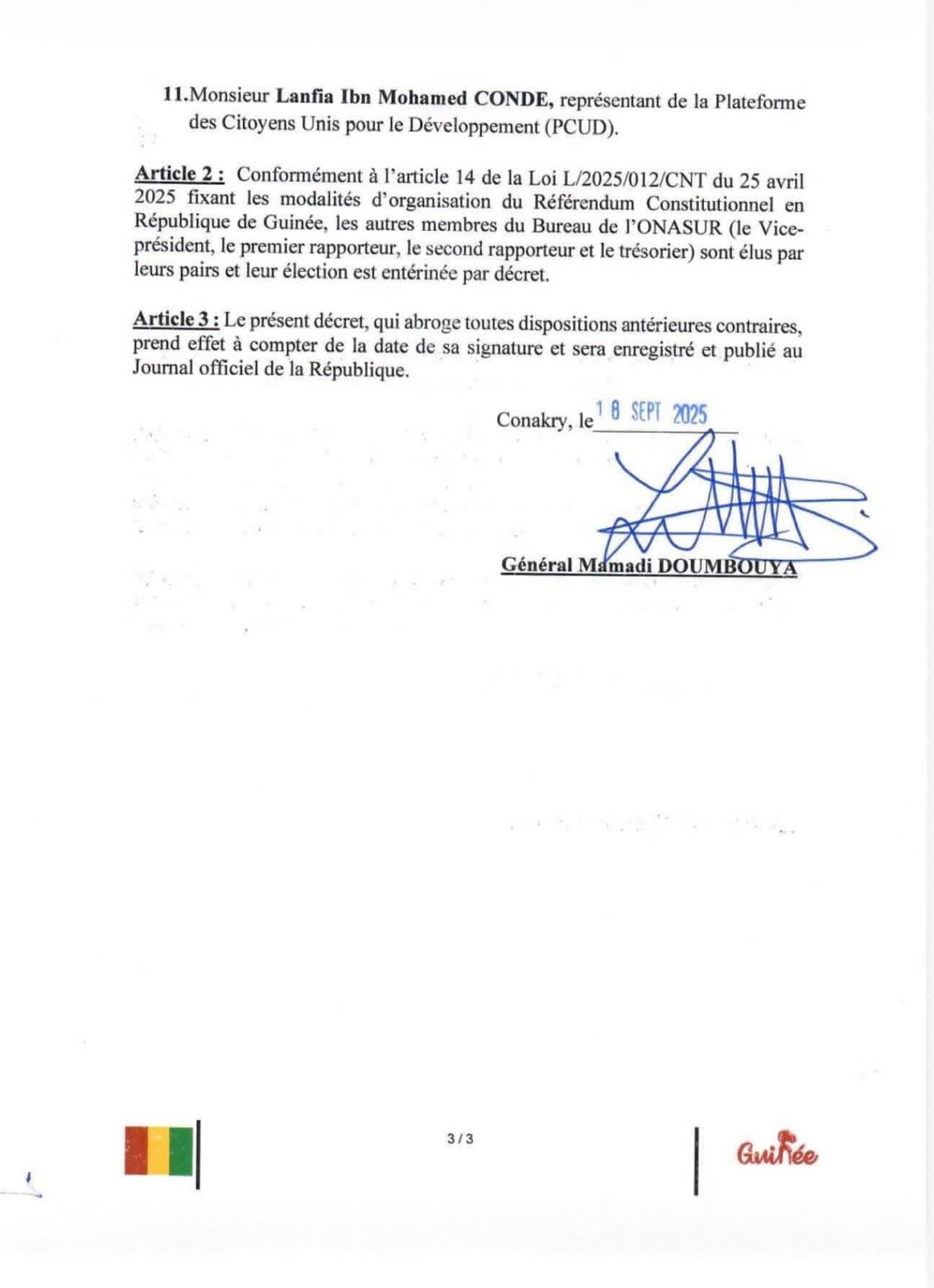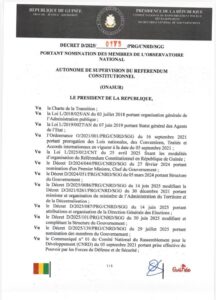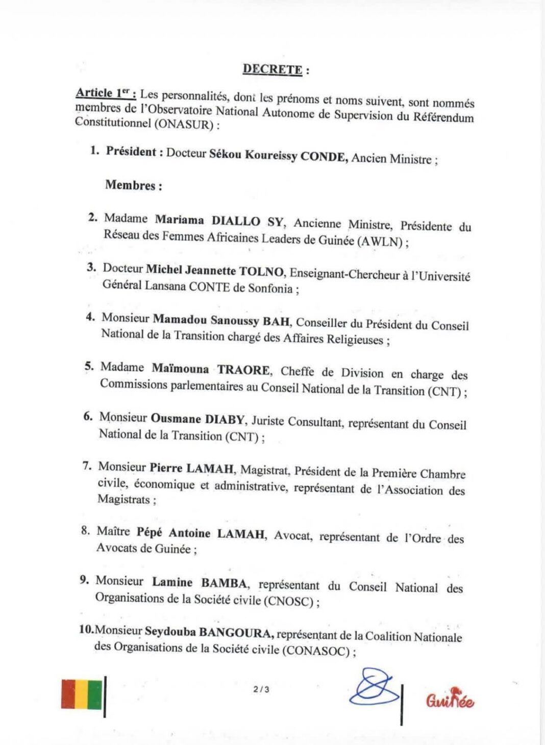 Par décret présidentiel, le chef de l’État, le Général Mamadi Doumbouya, a procédé ce jeudi à la nomination des membres de l’Observatoire National Autonome de Supervision du Référendum (ONASUR).